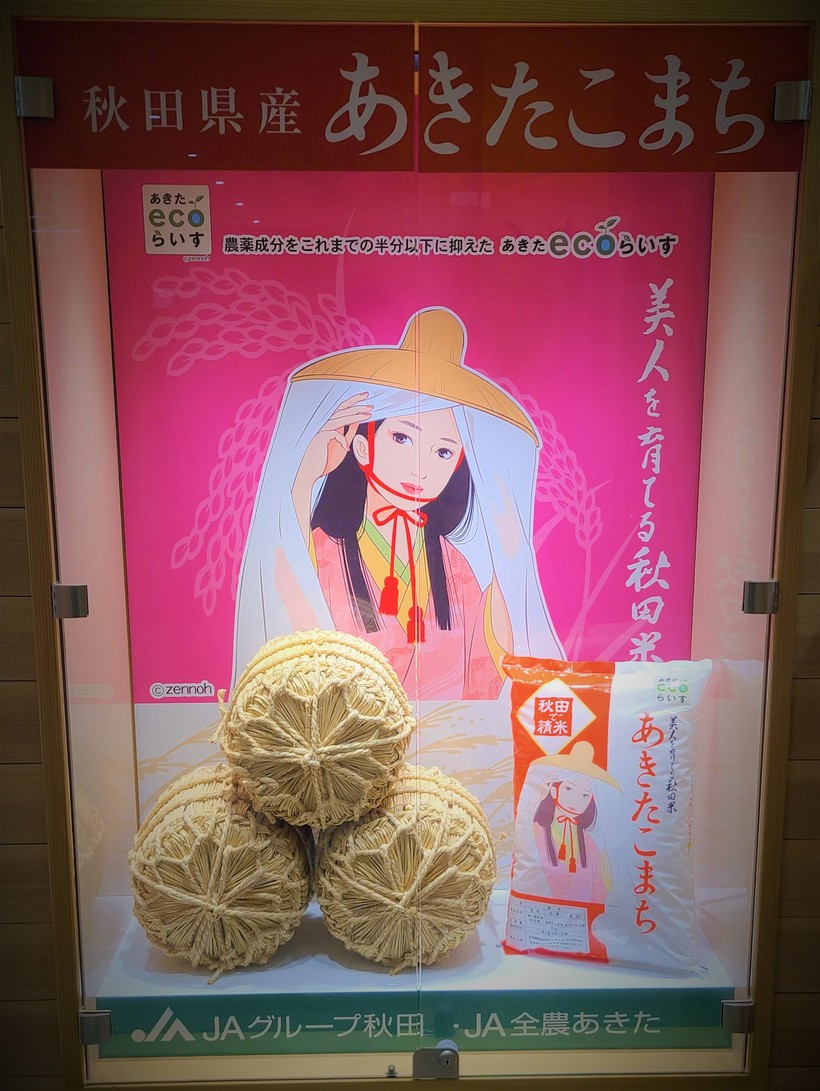 아키타현(秋田県)에서 브랜드쌀을 만들고는 네이밍을 공모를 했는데, 상기의 이유로 아키타코마치(あきたこまち)라는 이름이 결정이 되었고, 이름 자체에 미인을 뜻하는 단어가 들어가서 쌀의 패키지에는 미인이 등장하는데, 이 미인의 복장이 아주 인상적이다.