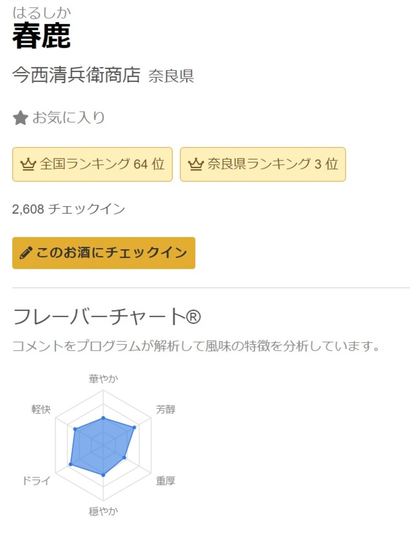 참고로, 톳토리현의 1위는 히오키자쿠라(日置桜)라는 술인데, 전국 172위이니, 얼마나 나라(奈良)가 격전지구인지 알 수 있다.