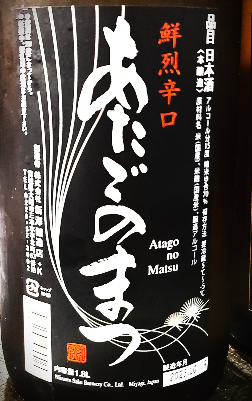1925년 메이지 일왕에게 니이자와 양조점의 2대 당주가 이 지역의 농지인 오사키코도(大崎耕土)에 대해서 설명을 할 기회를 얻어 알현하게 되었는데, 이를 일생일대의 영광으로 여겨 양조장 인근에 있는 아타고산(愛宕山)에 뿌리를 뻗은 소나무(松)에 비유하여 브랜드명을 아타고노마츠(愛宕の松)라고 짓게 되었다.