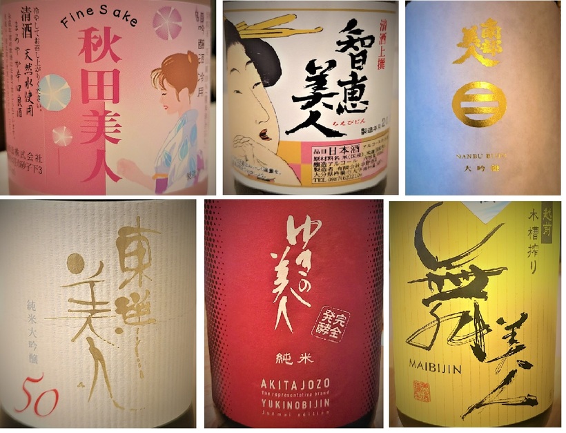 아예 브랜드 자체에 미인이라는 단어가 들어가는 치에비진(智恵美人), 도요비진(東洋美人), 츠무기비진(紬美人), 남부비진(南部美人), 미야코비진(都美人)과 같은 술도 있고, 여자와 관계된 네이밍이나, 그림이 들어가는 세키무스메(関娘), 아사이치무스메(朝市娘), 쿠도키죠즈(くどき上手), 온나나카세(女泣かせ) 와 같은 니혼슈도 있다.