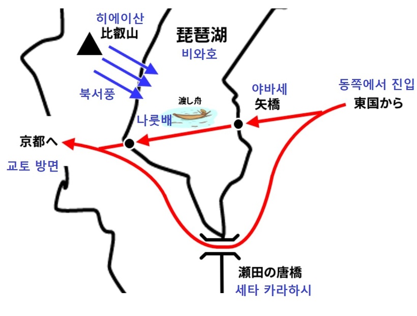 바로 쿠사츠(草津)의 야바세(矢橋)라는 지역에서 건너편 오츠(大津)의 이시바(石場)라는 지역에 배로 비와호(琵琶湖)를 건너서 이동하는 것인데, 시간은 많이 절약이 되나, 맞은편 히에이잔(比叡山)에서 불어오는 북서풍이 맞바람이 되어, 시간도 많이 걸리게 되고, 배가 작다 보니, 위험하기도 했다.