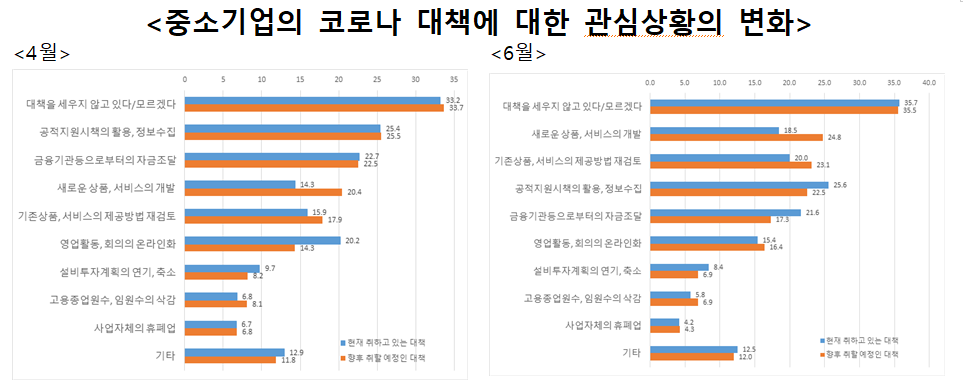 향후의 사업 면의 대책으로 가장 관심이 있는 것은 무엇인가 하는 설문에, 4월 시점에는 향후 취할 예정의 대책에서 ‘대책 없음, 향후의 대책은 모르겠다’, ‘공적지원시책의 활용, 정보수집’, ‘금융기관등에서의 자금조달’이 상위였지만, 6월 시점에서의 조사결과에는 ‘대책 없음, 향후 대책은 모르겠다’는 그대로였지만, ‘새로운 상품, 서비스의 개발’, ‘기존 상품, 서비스의 제공방법의 재검토’가 상위로 올라왔다.