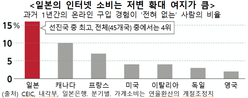 독일의 조사회사 스타티스타에 따르면, 일본 인터넷 사용자 가운데 온라인 구입의 경험이 과거 1년간 없었던 비율은 16%였다. 선진국 가운데 가장 높고, 신흥국을 포함한 45개국 가운데서도 4번째로 높았다.