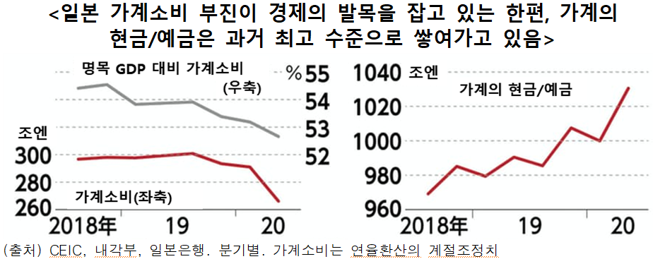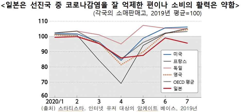 소비 침체가 국내 경제의 발목을 잡고 있는 모습이 뚜렷하다. 2020년 2분기의 가계소비는 266조엔(명목, 연율환산)으로 1분기에 비해 9% 감소했다. 명목 GDP(국내총생산)에서 차지하는 비율은 52.7%로 1분기에 비해 0.5%포인트 낮아졌다. 최근 7월의 소매판매액은 6월에 비해 3% 줄었다.